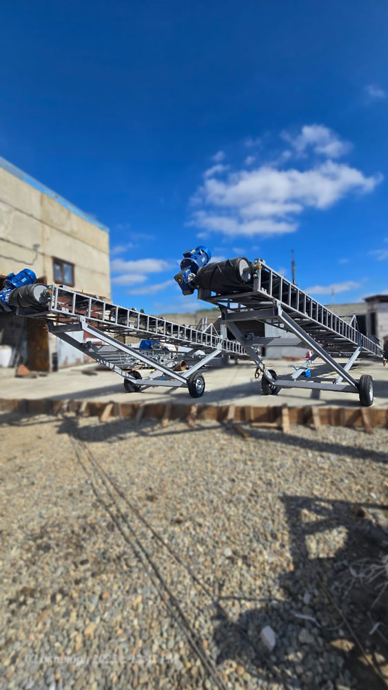 Ленточный желобчатый наклонный транспортер с регулируемой высотой для транспортирования сыпучих, инертных и кусковых материалов с подъемом по трассе